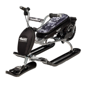 Удлиненное мягкое сиденье позволяет вместить двух детей, а система амортизации обеспечивает комфортное путешествие по крутым горкам и неровным поверхностям. Буксировочный трос с автоматической намоткой упрощает транспортировку, а усиленный широкий тормоз эффективно работает даже на обледенелых дорогах.